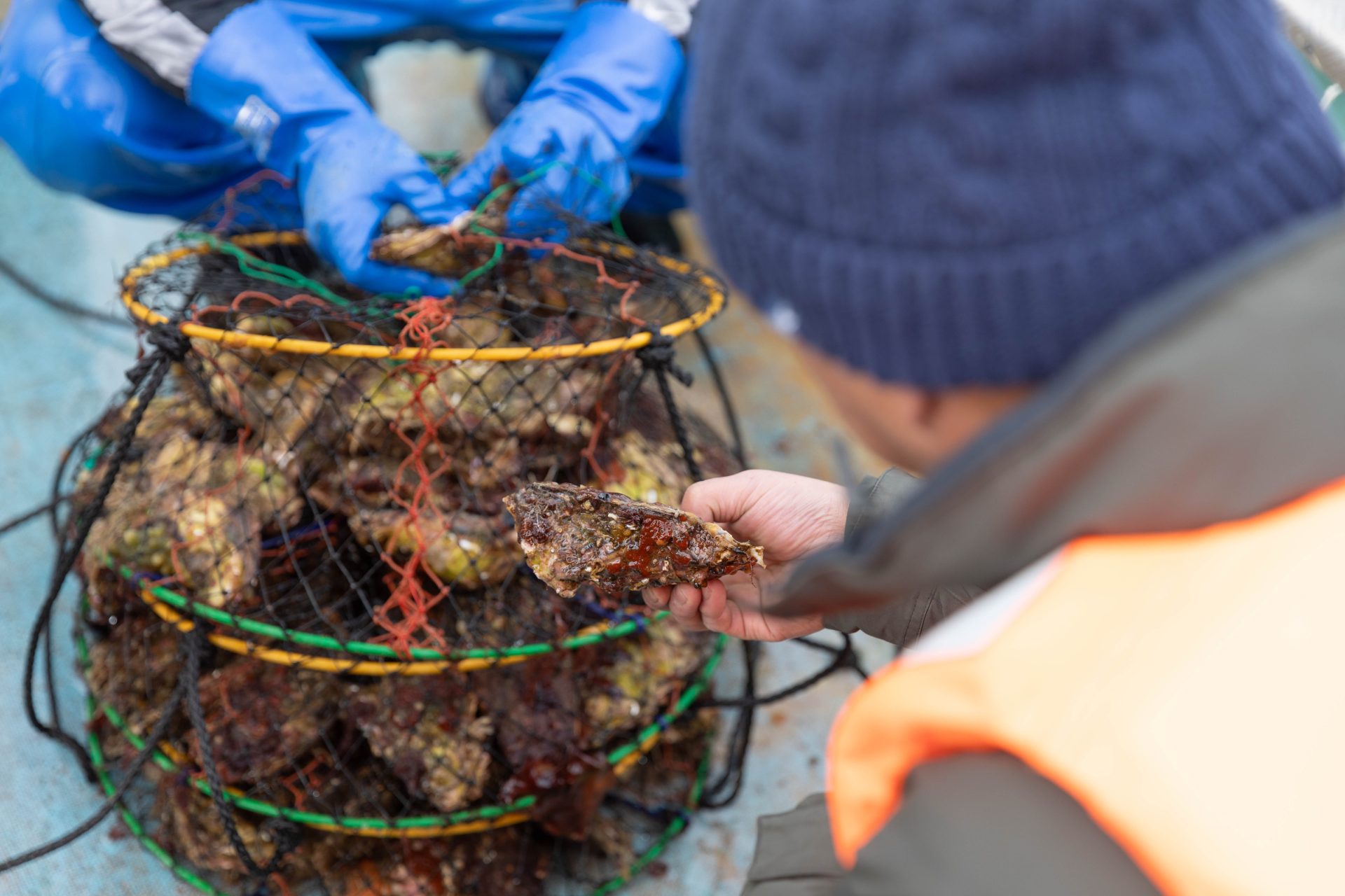 雄勝湾には川がなく穏やかですが、水深が深く水温の変化も少ないため、牡蠣が十分大きくなるまで長期間育てるのに適した環境です。