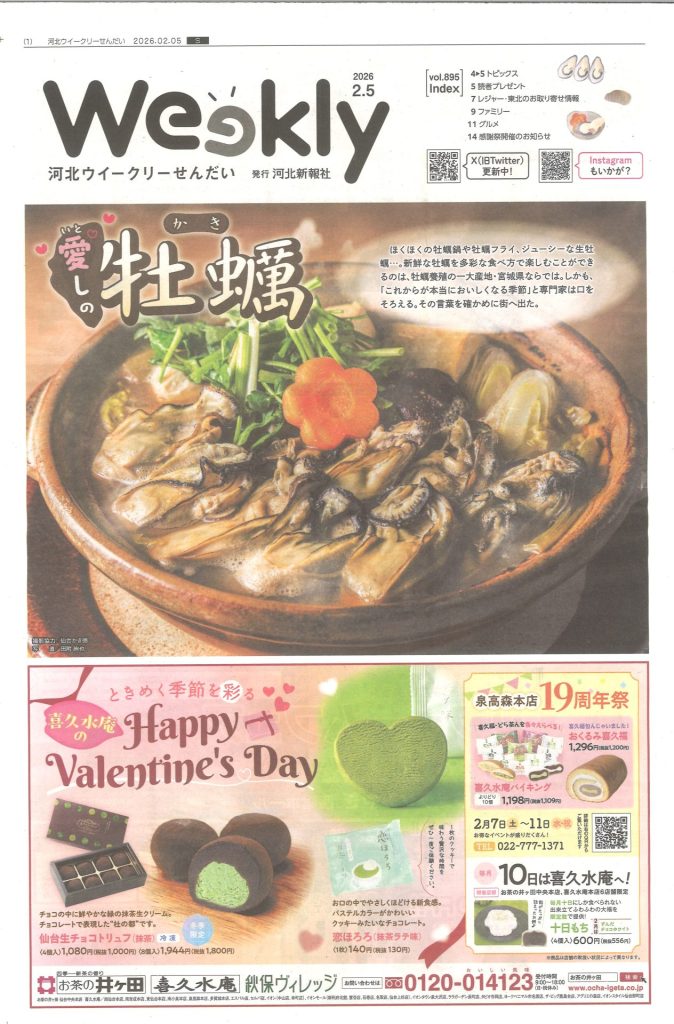 トップページ メディア掲載 「河北ウィークリーせんだい」でご紹介いただきました 2026.2.5 「河北ウィークリーせんだい」でご紹介いただきました 田里津庵藤田喬平ガラス美術館 「河北ウィークリーせんだい」(発⾏/河北新報社)にて、田里津庵と藤田喬平ガラス美術館をご紹介いただきました。 巻頭特集の「愛しの牡蠣特集」にて田里津庵の究極のかきフライを、トピックスのコーナーにて藤田喬平ガラス美術館のガラスのお節句展をご紹介いただいております。 ぜひお手に取ってご覧くださいませ。 詳しくはこちら 一覧へ戻る 次のページ