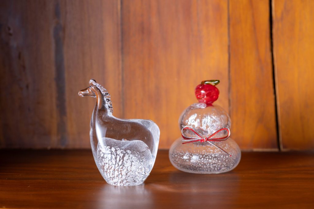 展示には、日本各地で活躍するガラス作家22名の一点ものが集結。干支の置物や鏡餅などの縁起物から金箔の入った酒器やプレートなどハレの日にふさわしい器など生活を彩るアイテムが並びます。すべての作品は実際にご購入いただけます。暮らしを豊かにするインテリアとして、また特別な贈り物としても最適です。